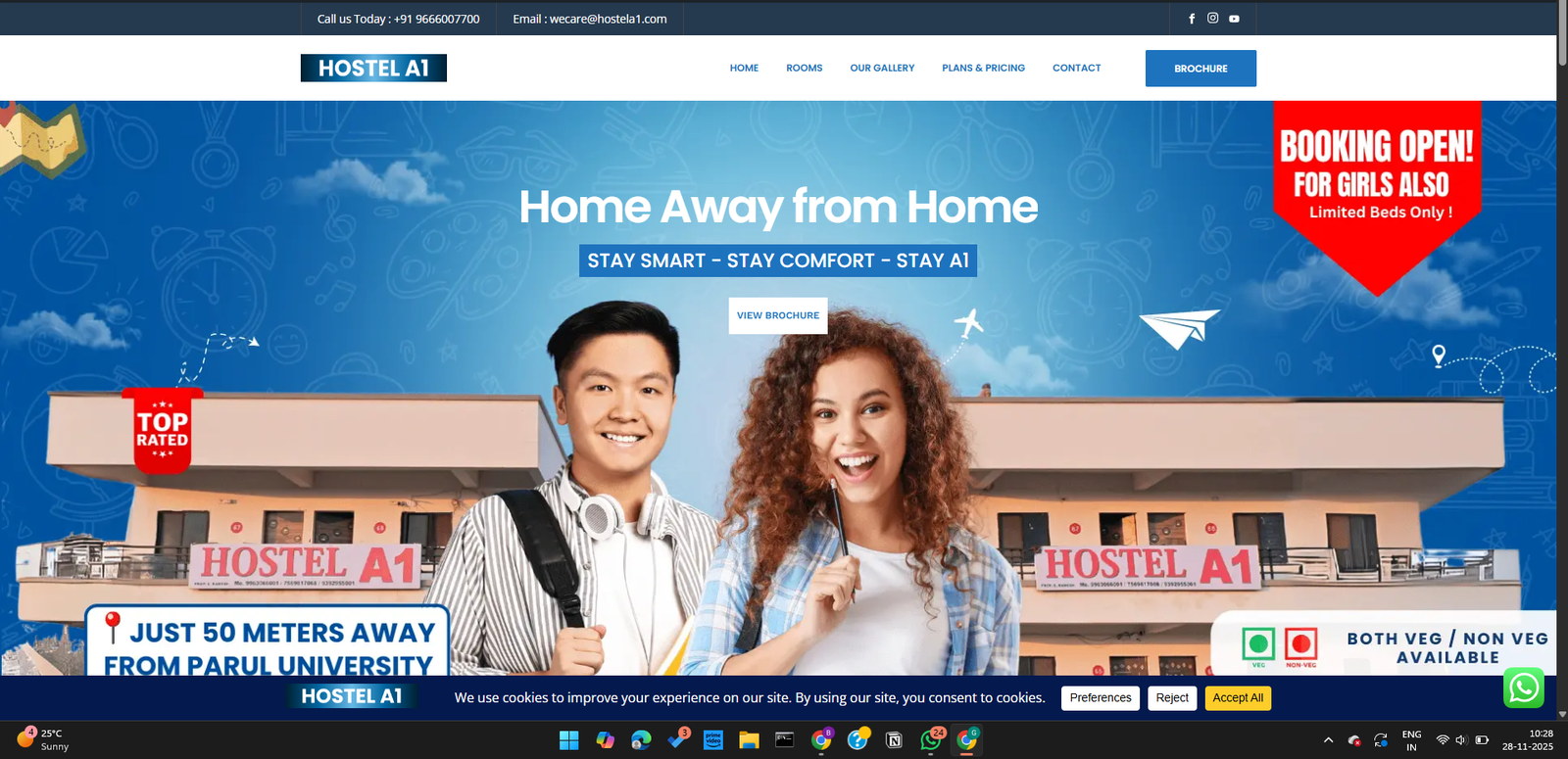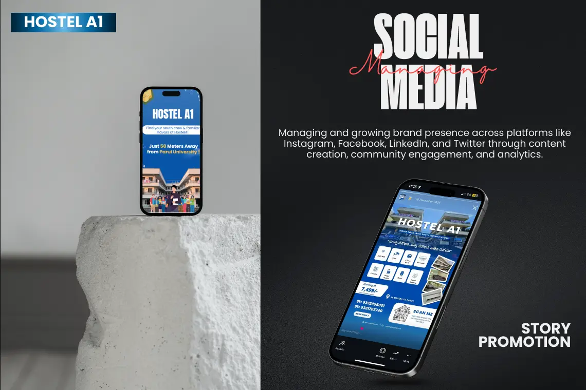 We developed a cohesive visual and messaging identity for Hostel A1’s Instagram, Facebook, and WhatsApp marketing channels, complemented by high-quality posters and brochures for offline promotions. The tone was welcoming, modern, and student-centric, highlighting features like 24×7 security, Wi-Fi, furnished rooms, mess services, and community events.